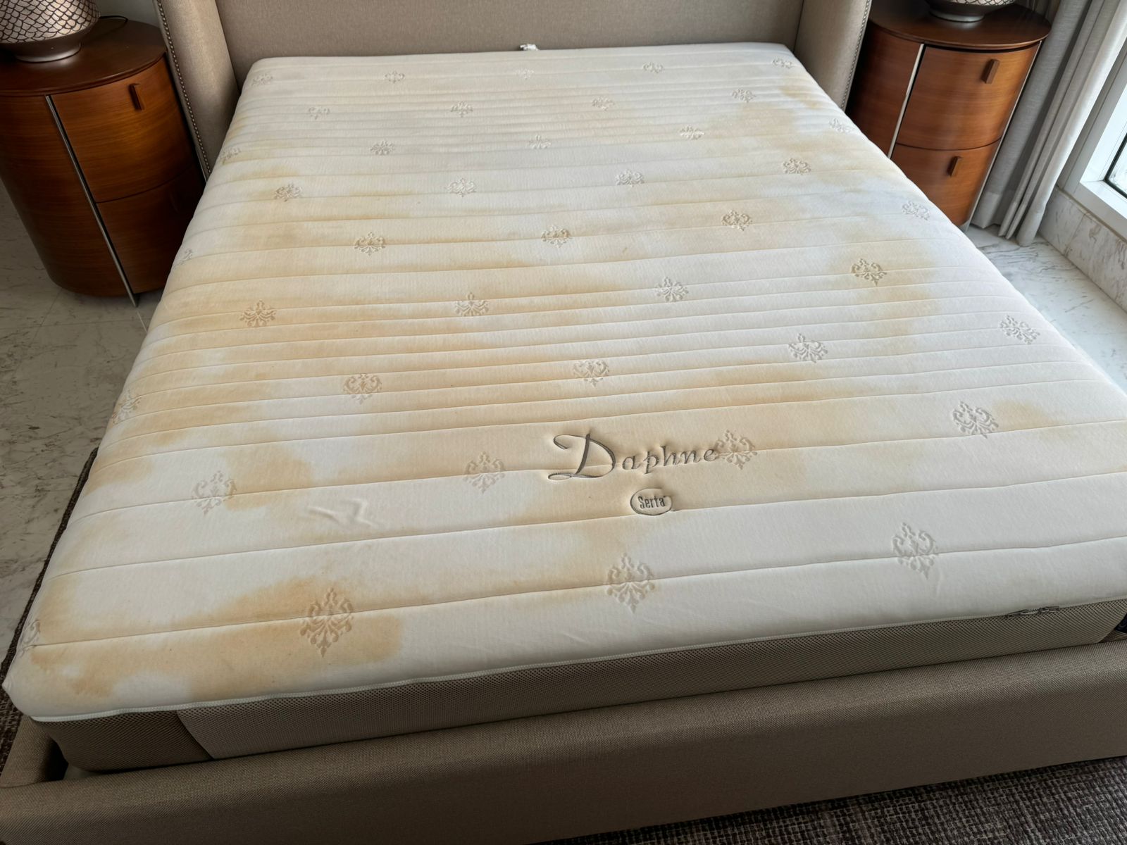 Proses pemutihan mattress yang sudah menguning karena pemakaian lama menjadi seperti baru ( hasil bergantung kondisi mattress). Bukan proses penghilang noda.